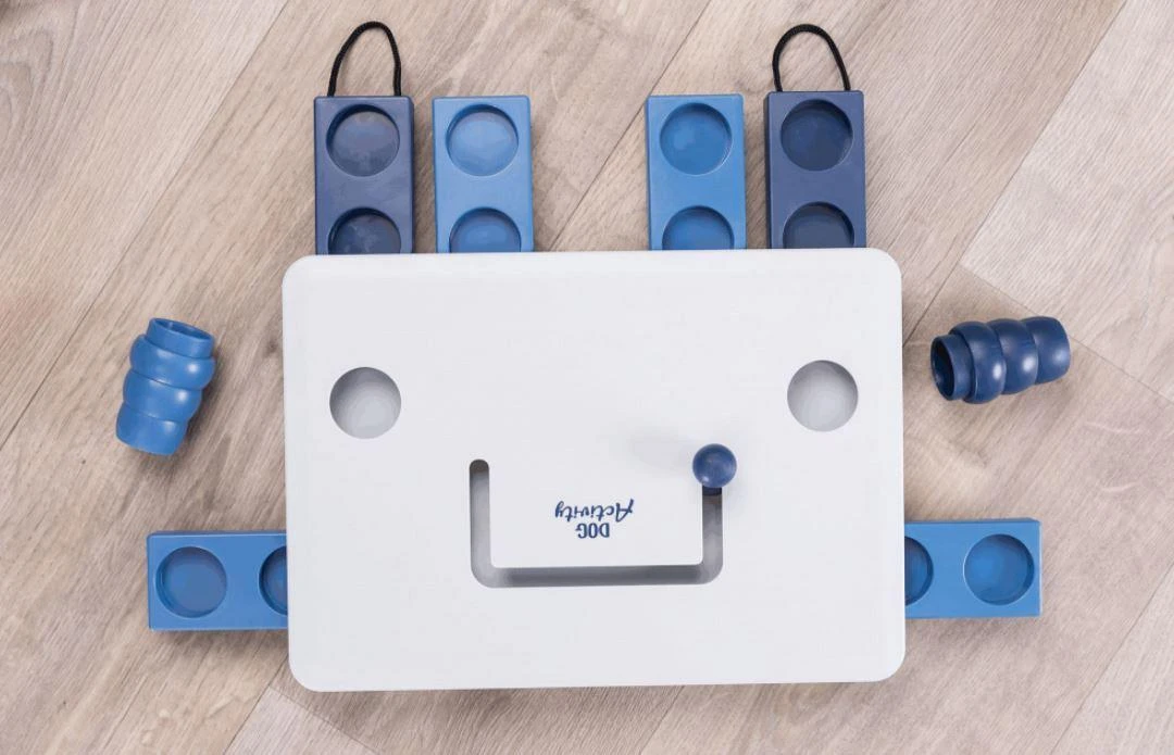 bordspel voor gevorderden: door de lades met behulp van de lussen te openen dan wel de stempel te verschuiven, komt de hond bij zijn beloning bordspel met 2 kegels en diverse kleine kommetjes en lades door de kegel als stopper te gebruiken, kan de moeilijkheidsgraad worden opgeschroefd kunststof slipvast door rubberen ring incl. handleiding met tips en handigheidjes voor een optimale training